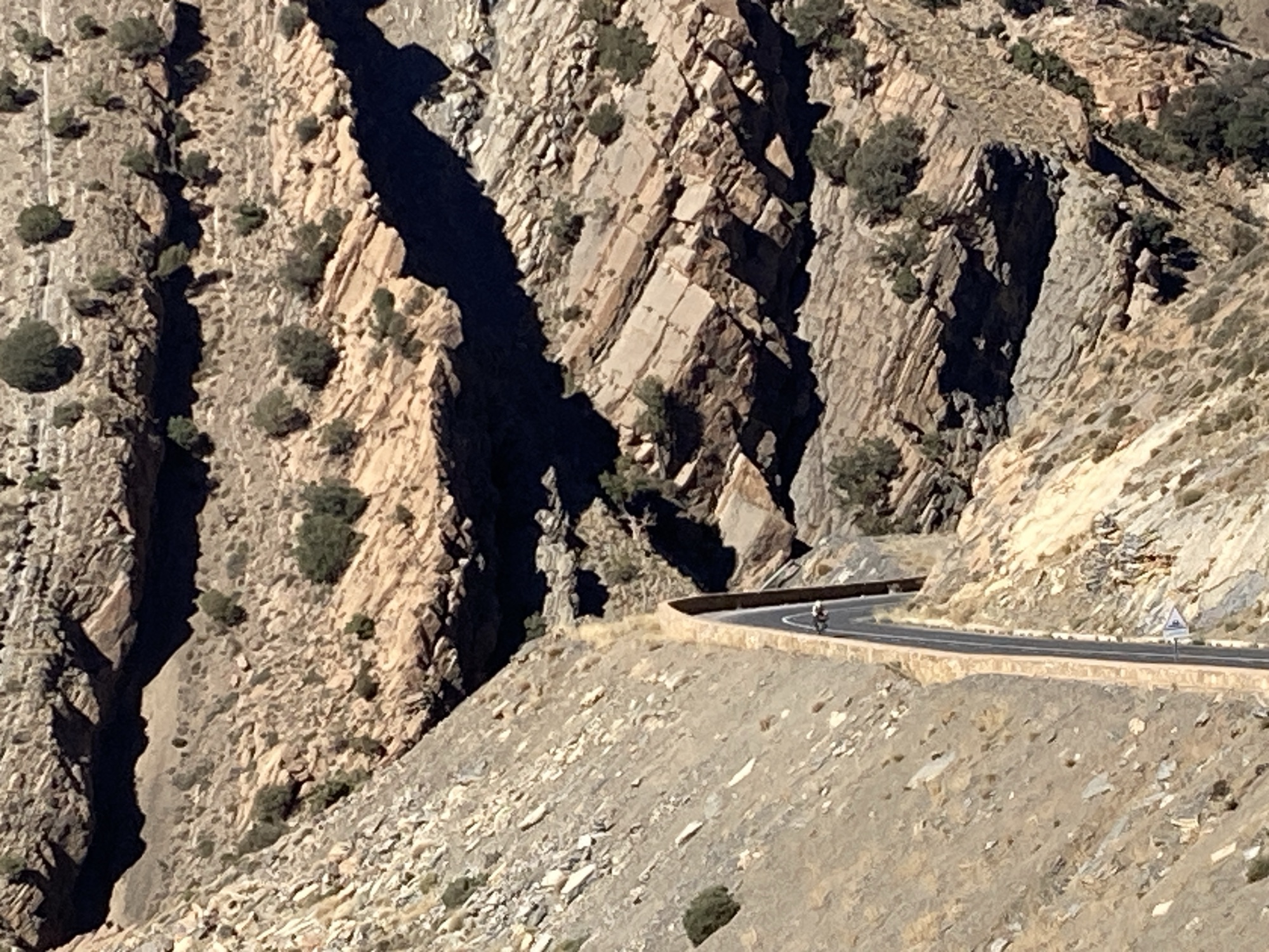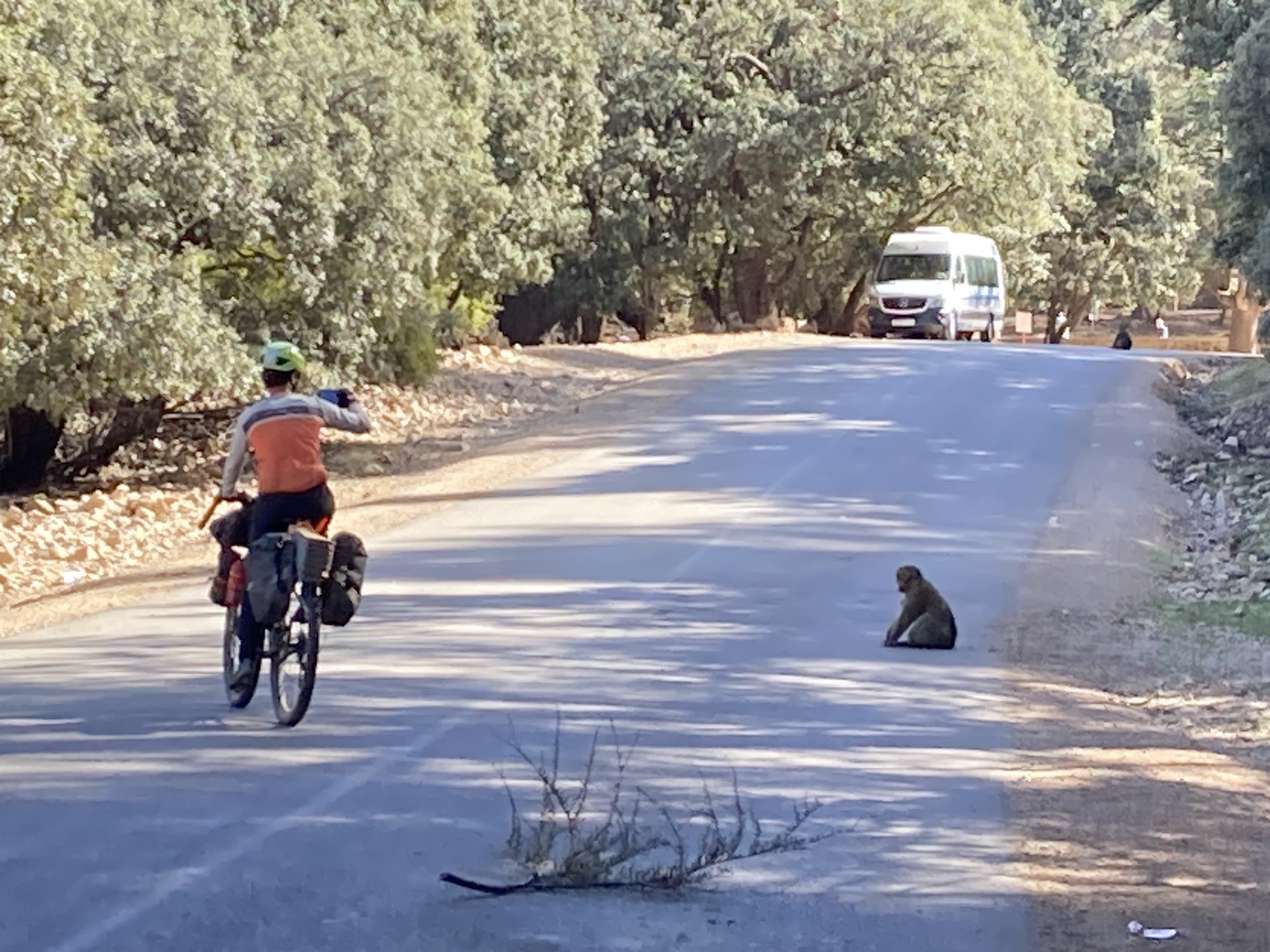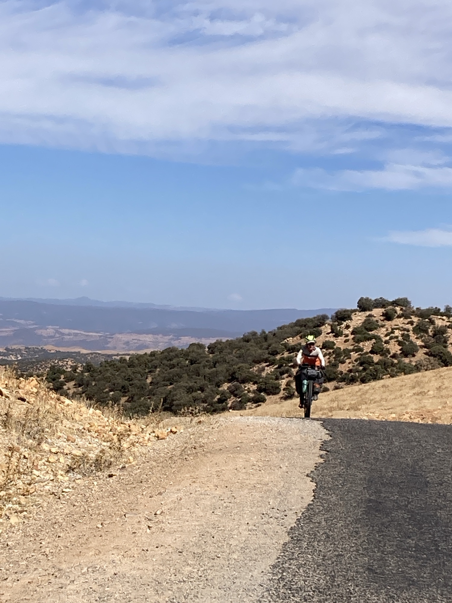 We rolled south for half a day and hit The Route, and after some impressively steep climbs (12-17 percent grades) in the foothills of the Rif we plunged back down equally-steep to the Mediterranean port city of Tetouan, which gave us a good sense of the jangley nature of Moroccan cities; the traffic (cars, vans, trucks, peds, burros, Motos/scooters, etc on ancient narrow cobbled streets were a far cry from the orderly Euro streets and mostly-protected bike lanes that we’d had for the last coupla weeks. But one of the great beauties of established routes – and apps like Komoot -is their ability to navigate the best route through cities, and even if it’s not necessarily nice riding, it’s efficient and just as we do with Google maps in US cities we don’t know well we were able to get turn by turn directions that led us out of town pretty quickly, and with more steep climbing found ourselves in a national park.
