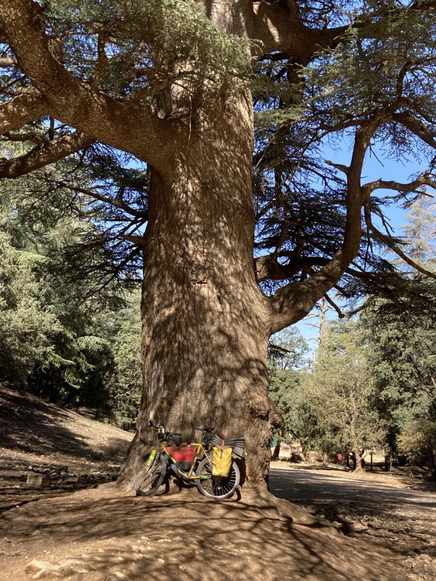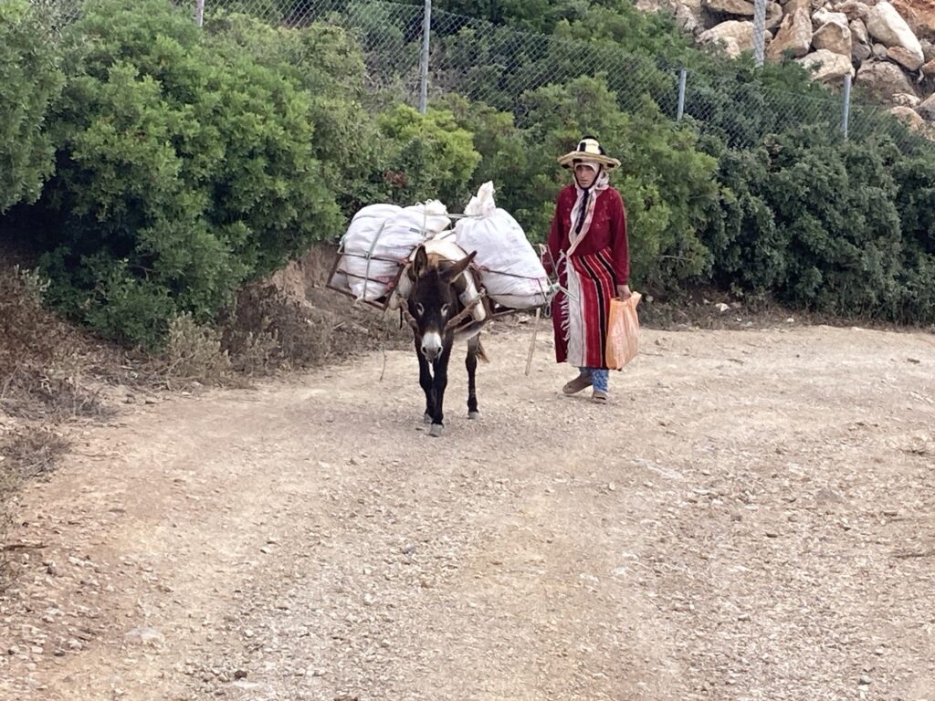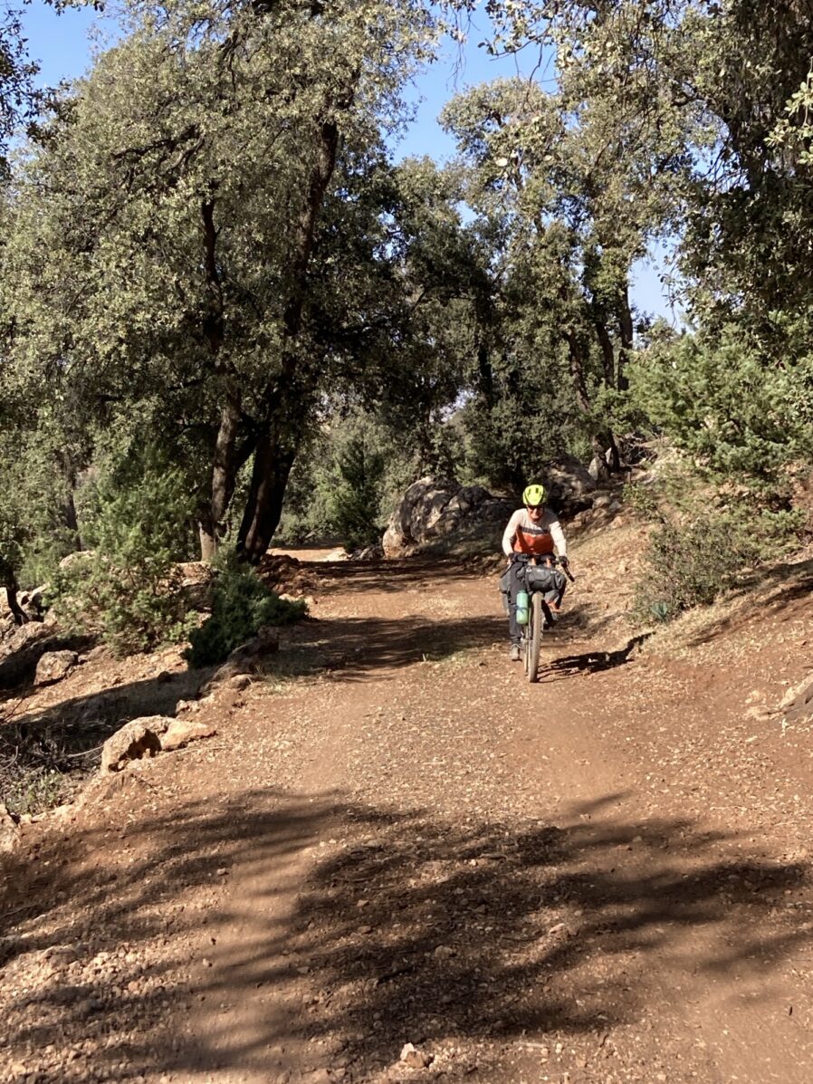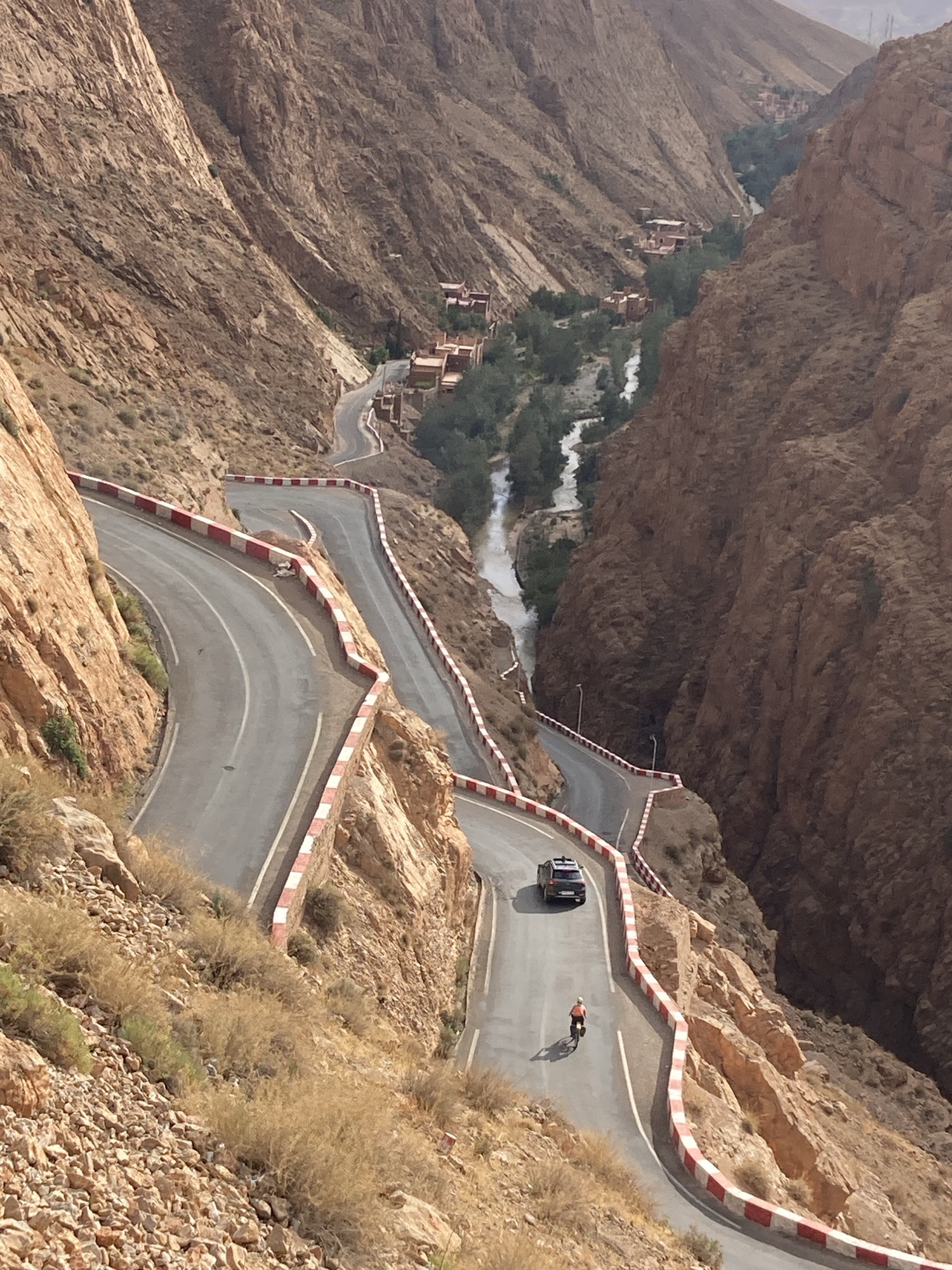 We rolled south for half a day and hit The Route, and after some impressively steep climbs (12-17 percent grades) in the foothills of the Rif we plunged back down equally-steep to the Mediterranean port city of Tetouan, which gave us a good sense of the jangley nature of Moroccan cities; the traffic (cars, vans, trucks, peds, burros, Motos/scooters, etc on ancient narrow cobbled streets were a far cry from the orderly Euro streets and mostly-protected bike lanes that we’d had for the last coupla weeks. But one of the great beauties of established routes – and apps like Komoot -is their ability to navigate the best route through cities, and even if it’s not necessarily nice riding, it’s efficient and just as we do with Google maps in US cities we don’t know well we were able to get turn by turn directions that led us out of town pretty quickly, and with more steep climbing found ourselves in a national park.