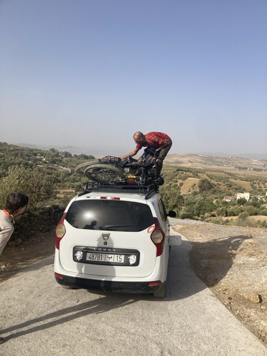 Our next stop is the city of Fez, a day’s ride away, and a glance at the map shows not only kinda bleak terrain that’s also hilly, but the temps climb a few more degrees. I’m out. As always in developing countries, there are people who will make anything work, and our guesthouse owner finds a taxi driver who will strap our bikes onto his roof rack and drive us to Fez. I’m in!