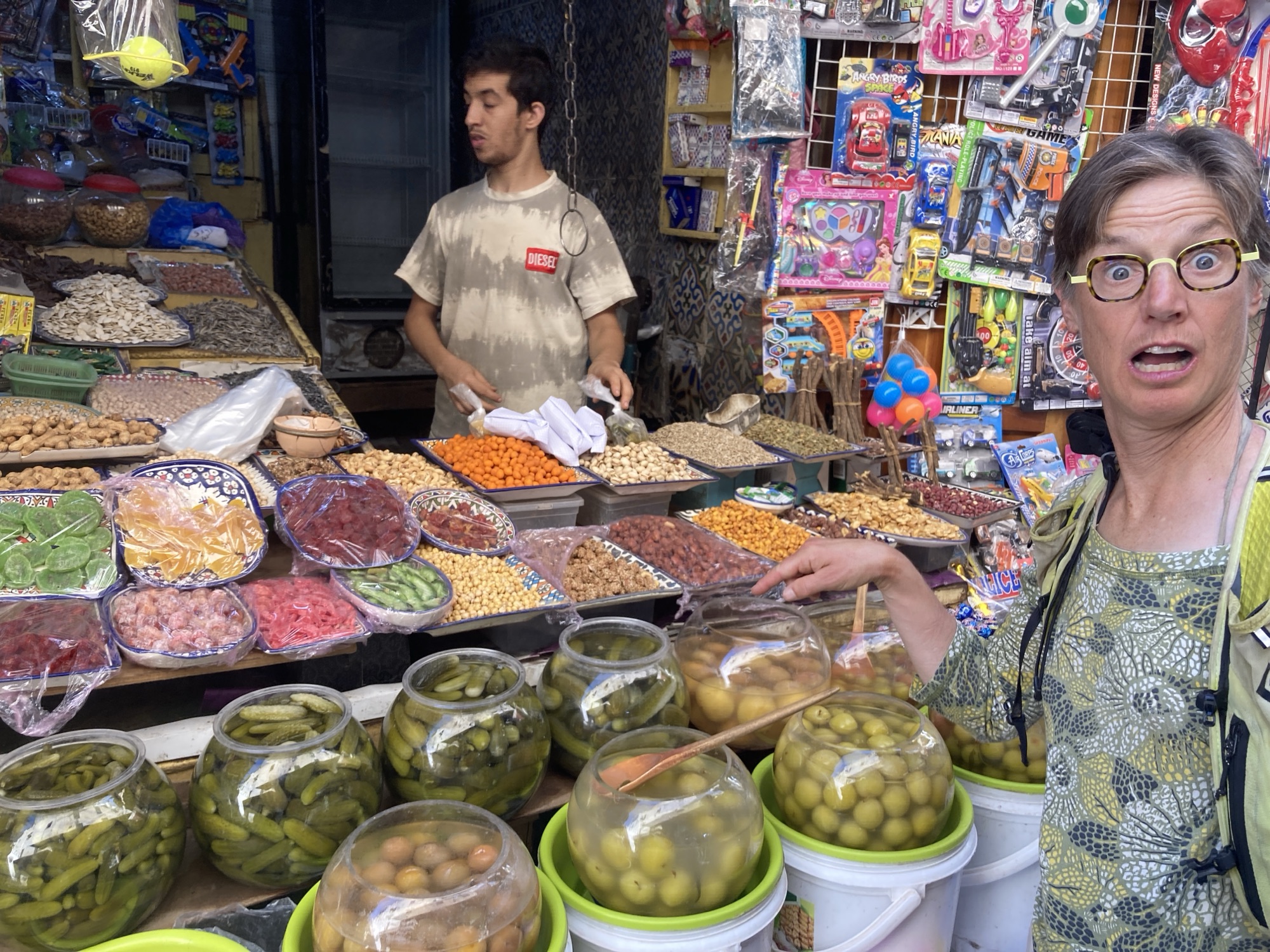 Fez is a famous city, not just for its namesake hat (which isn’t that popular, actually) but for it’s “medina” (market) which, according to whom you talk to, is the biggest in Morocco or the world. It was created a zillion years ago and is an incredible maze of little streets stuffed with tiny shops selling everything from baked goods to shoes to rugs to hardware to spices, meat, cheese, fruit, clothes etc. As always on a bike tour we were not tempted to buy anything we couldn’t consume pretty quickly, but though we aren’t necessarily “shoppers” per se it was amazing to aimlessly stroll the labrynth of alleys and then try to find our way back to our little guesthouse place (that was super quiet, despite being just off the heart of the Medina).