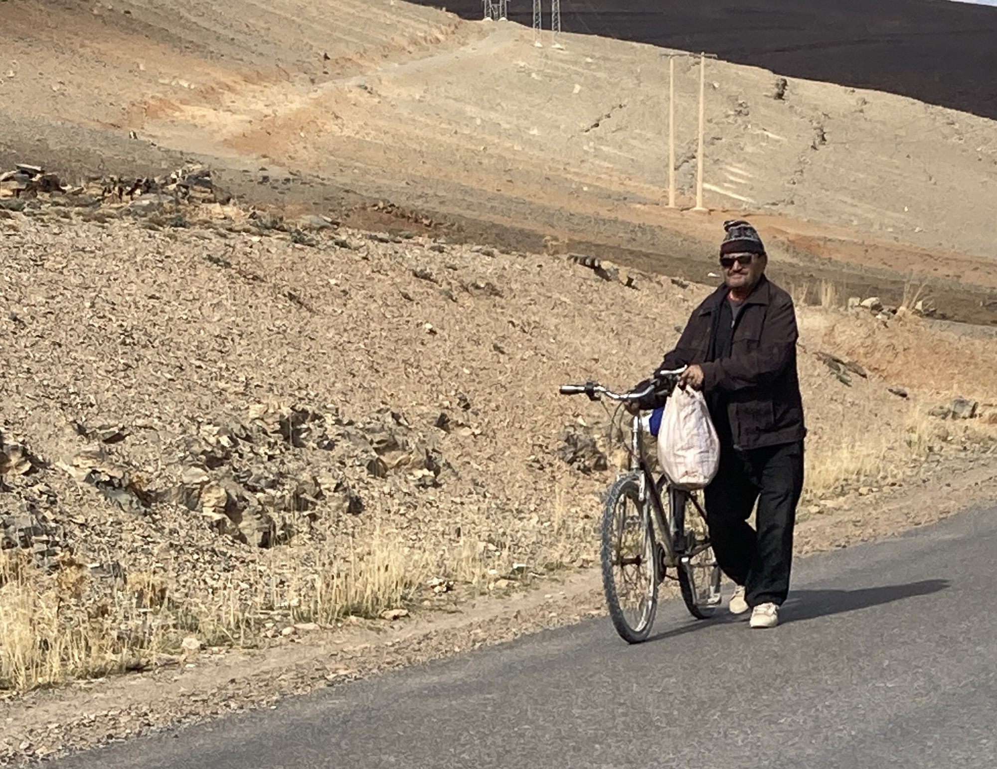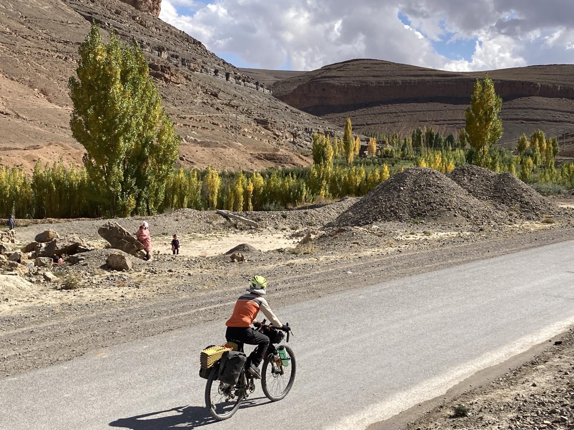 The only problem with the first week of the trip was the heat; of course we knew that Morocco was hot, but by arriving in early October we hoped that they would be moderated. Perhaps they were – slightly? – and it didn’t sound too bad: 80’s for a high. But I was putting this into my own perspective of living in an environment with sub-10% humidity and conveniently forgot that we were quite near a large and famously-warm Meditteranean sea, which was manifested on land as looking like a desert, but the air was actually around 60% humidified. I’d love to say that I was being cooled by the rush of air flowing past me as we blissfully sailed along on our bikes on delightfully-rolling roads, but creeping up 15% hills for surprisingly long periods of time just turned me into a sweat machine with no evaporative cooling. So I got hot. For a coupla days I did okay with trying to take it pretty easy and drinking a lot, but since we were so roasty and salty we were not keen to camp and were looking for places to stay and did what would normally be a fine distance/vert combo to get to a random guesthouse kinda in the middle of nowwhere, but I kinda spiraled into heatdom despite copious drinking and between resting and pushing my bike up hills it took me 2 hours to make 6 or 7 miles. We veered off the main road onto a gravel track, went flat for a bit and asked where the place was, and the kids pointed upwards…way up a 20% lane. The kids were bugging me asking for money, and I had an idea: offer them the equivalent of a dollar for pushing my bike up the hill…what could go wrong? They started pushing up, and suddenly I see the kid is going into my bag! I dive for him and the bike, my leg cramps up, and I fall into some sticker bushes as the kids laugh and run off. I’m writhing around in the sticker bushes and all of a sudden Ash is there with a guy speaking English and it’s the proprietor of our place. My cramps fade briefly, he throws my bike (and me) into his van, and we head up the hill where I stumble into his place while Ash seemingly, effortlessly (to me) rides on up.