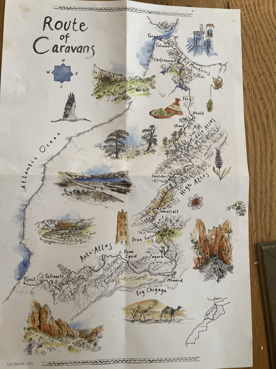 A few years ago we met Kris Erickson, who was our guide on a ski trip to Svalbard, and while Kris hails from the Bozeman area originally and has spent most of the last many years in Chamonix, he loves Morocco, and he and his family have also built a life there, with Kris guiding in the High Atlas mountains and Chloe running a foundation that helps Moroccans improve their quality of life.  A month later while riding in Scotland we met a great couple from Amsterdam on their bikes (not surprisingly) and rode with them for a day exchanging tales of various bike adventures.  One thing that really stuck out for us was their love of Morocco as a cycling destination; they’d been there five times!  As folks do on one trip, we started doing a bit of research on another trip (enhanced by the concept of a very dry place, in contrast to the very wet Scotland that we were experiencing!) and Morocco did indeed sound pretty amazing.  Fast forward a coupla years, and the good folks at Bikepacking.com completed the “Route of the Caravans” bikepacking route (south and north)that is 1200 miles long, mostly through the Atlas Mountains (High Atlas, Mid-Atlas, and Anti-Atlas, as well as the Rift Mountains) and dipping into the Sahara in the South.    Despite the fact that it’s pretty far from a lotta places, this route seems to already have gotten quite popular with the “out there a bit” bikepacking crowd, and it sounds great.  So we are gonna give it a go.