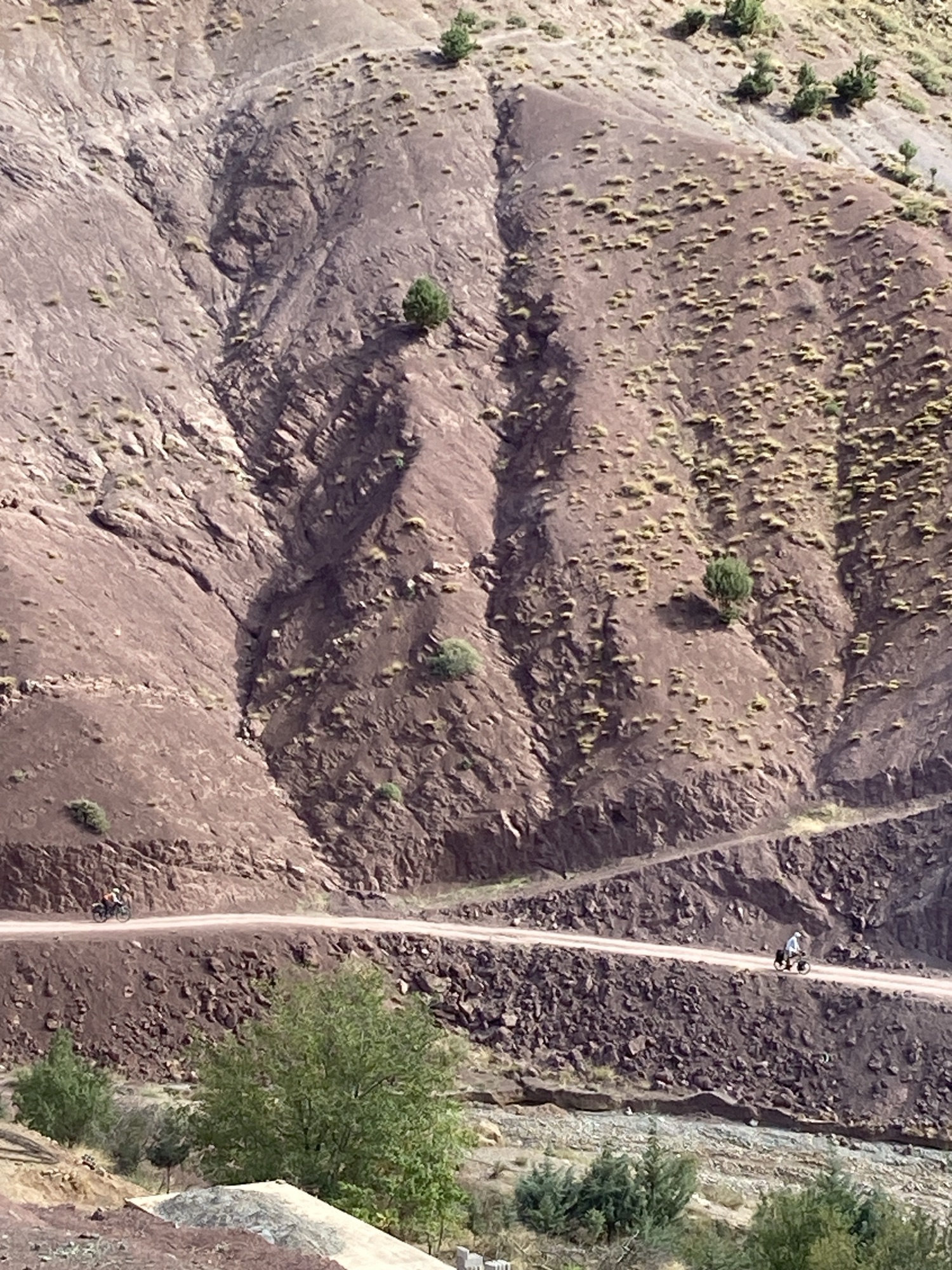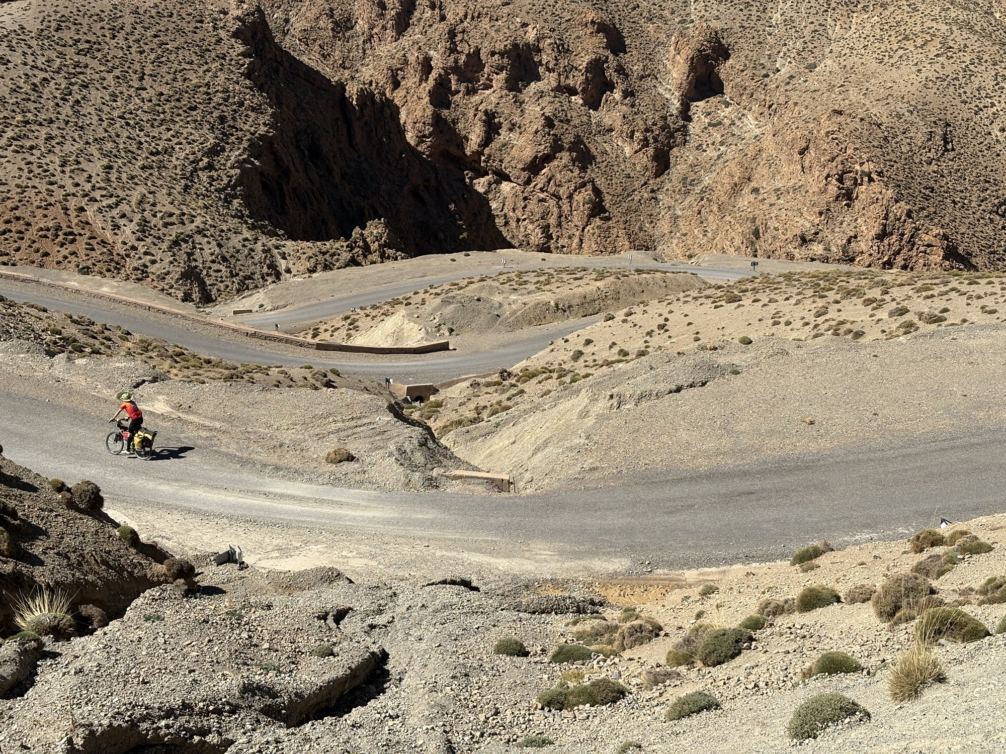The Dades Gorge kinda forms the Northeastern side of the High Atlas mountains, and as The Route continued south we veered west into the mountains, and started a series of days of big climbs and descents. And they were amazing; we love riding in the mountains, and have spent many days doing big climbs all over the place, and these rides were as good as any climbs/descents we’ve done anywhere, rivaling those of the Pyrenees, Alps, Beartooths, etc.