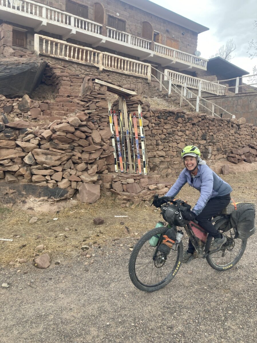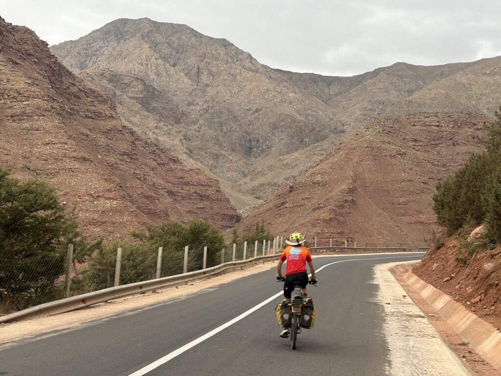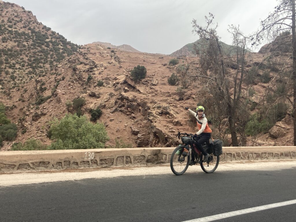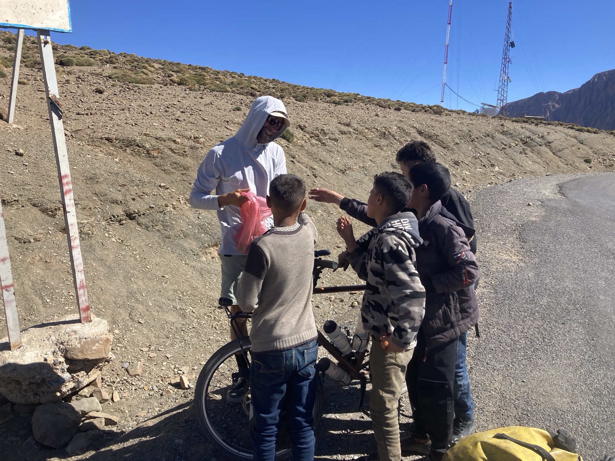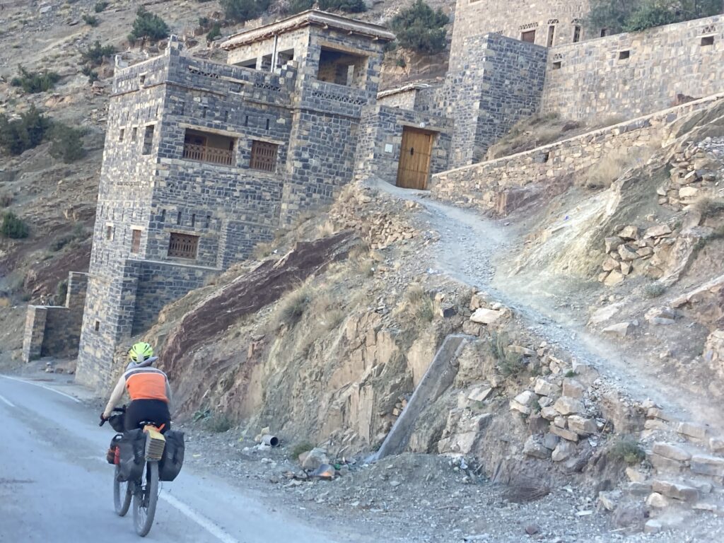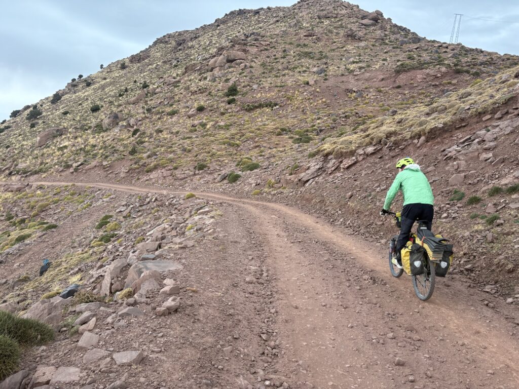 With tajine-powered legs (more on that later) we slowly made our way up the long climb to what turned out to be the highest pass in the country at just over 3000 meters (9800’) and as I rolled to a stop there was – to my surprise – another cyclist. He turned out to be Livio, a French cycling enthusiast who – coincidentally – also started in Montpellier, France (where he lives) but instead of ferrying from Barcelona to Tangier like we did he “just” rode across Spain to Gibraltar to get to Morocco (about 700 miles). Livio is accustomed to long rides by himself; not long ago he also left from his house and rode many passes in the Alps before going through the Balkans, Turkey, Georgia, Armenia, Iran, and Afghanistan (in the winter!) to finish in Kabul. Take a look at a global map: that’s a crazy trip! And he was solo. As Livio put it: “I was looking for a big adventure, and I got it!” It turned out that we were on a similarly-flexible trajectory and pace as Livio, so we spent a nice 3 or 4 days riding with him, always amazed at his ability to climb with a too-heavy bike and a propensity to smoke cigarettes!