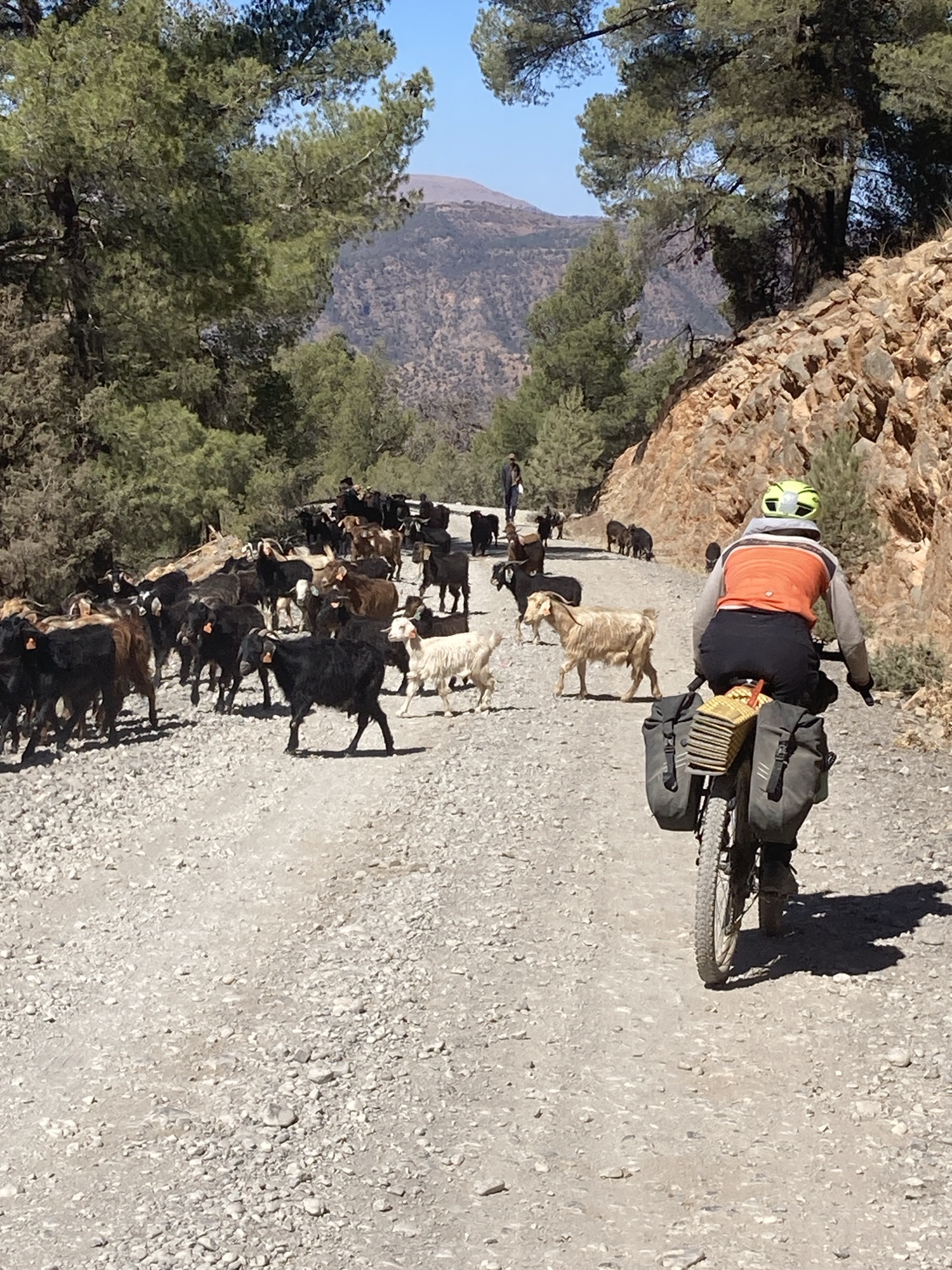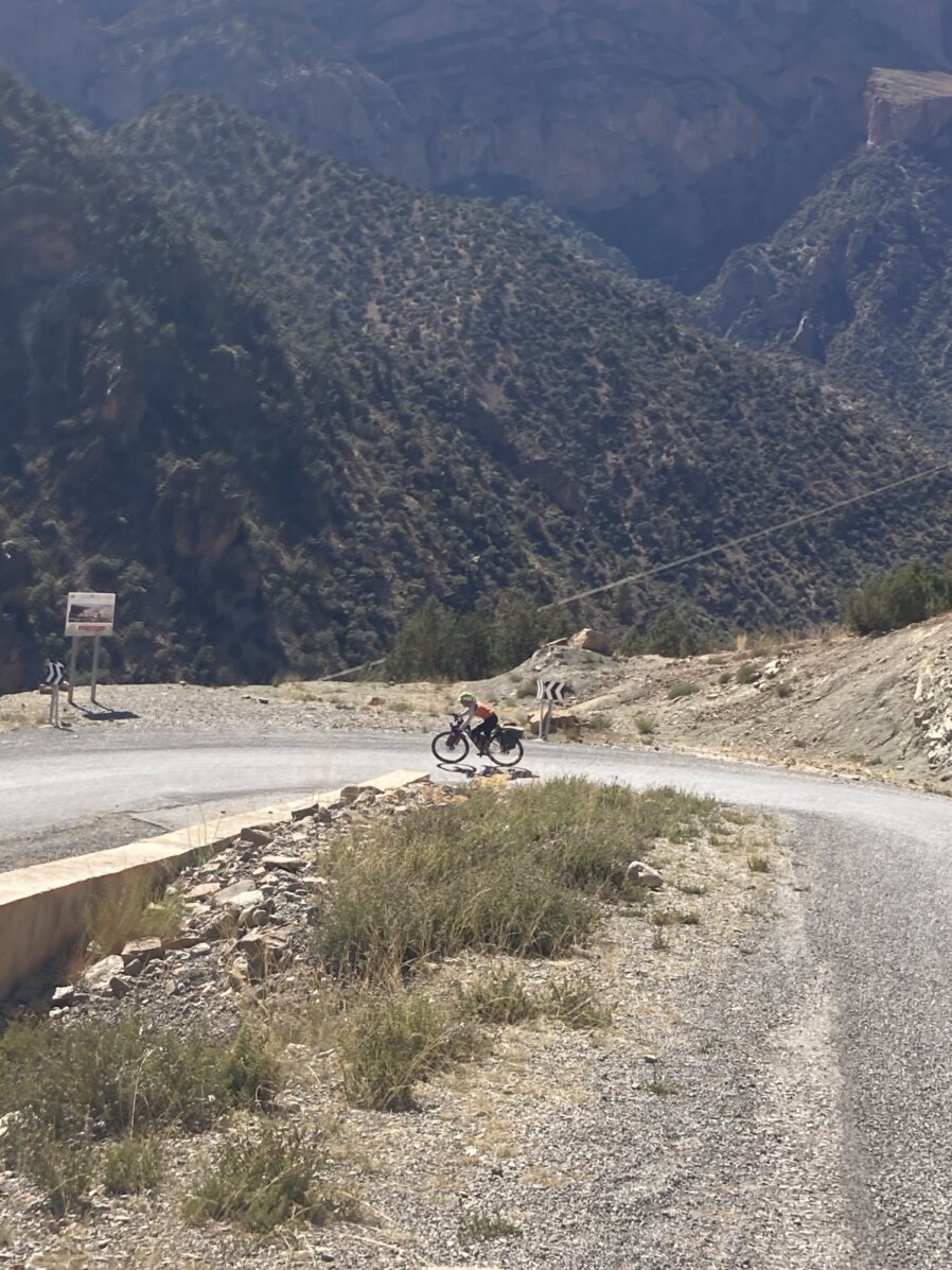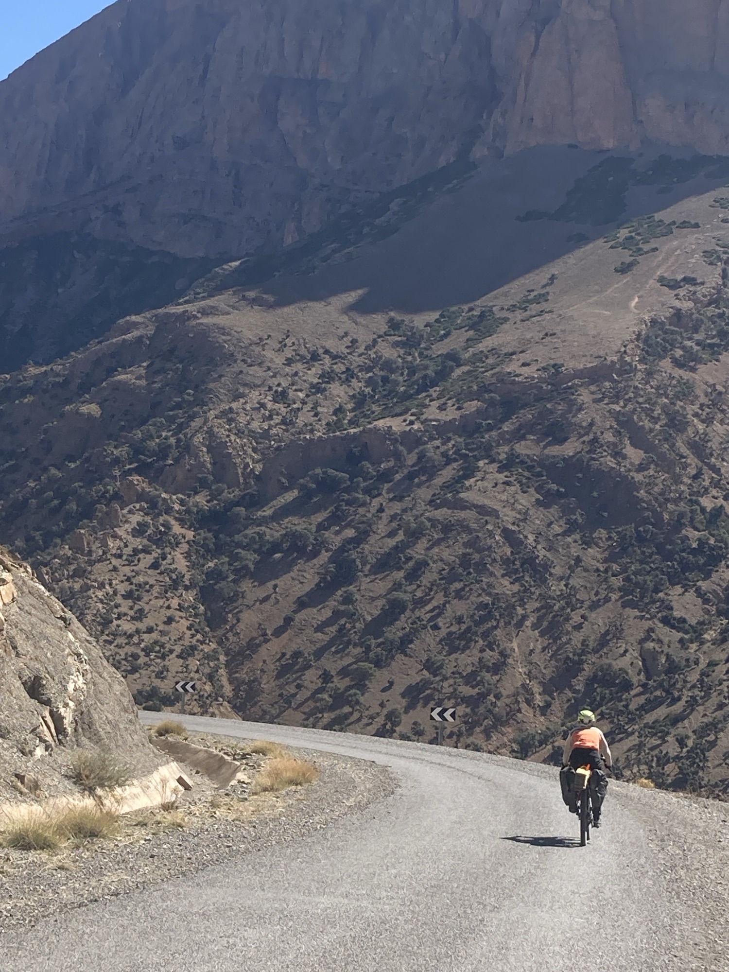 Nice and twisty and very aesthetic, and fortunately the pitches were mostly more manageable in the 5-8% range than the super steep stuff (12-18%) that we’d ground up in the heat in the Rif mountains. And the best part about them was that there was virtually no traffic; we’d see a car once every 15 minutes, and we had a couple of days where we saw literally a handful of cars, and the roads were basically single lane roads. And unlike the more temperate forested mountains of the north, these desert mountains allowed long views down the snaky descents, so while we got surprised a couple of times, most of the time we were well aware of where the cars, trucks, and motos were as we streaked down. The “motos” were either locals on scooters or – as often – Europeans on their enduro motorcycles in packs of 5-10; they always waved at us, but were a bit unnerving at times as they too were loving the ripping descents and – for them – ripping climbs.