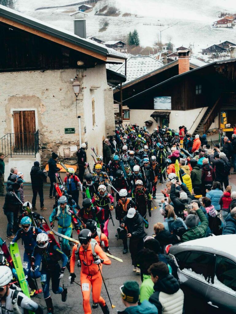 Each stage generally started with a long climb, typically in the 2500-3500 foot range that took us up into the alpine, and the weather that day was partly cloudy with a lot of flat light; a typical day in the Alps. So we could only catch in-and-out glimpses above us, and what we saw was amazing: skin tracks of long switchbacks heading up to either a steep couloir that was being booted straight up or continuing on to a high ridge, and little ants marching quickly and continuously the whole way; a sight that will probably be my most-lasting vision of the race, since it was so common. And people were movin’; typical backcountry skiers probably climb in the 1500 vertical feet an hour range, and in training on “Our Run” in Austria I was climbing in the 3000 feet/hour range, and the best guys are well-over 4000 feet an hour. So the ant lines were definitely in motion!