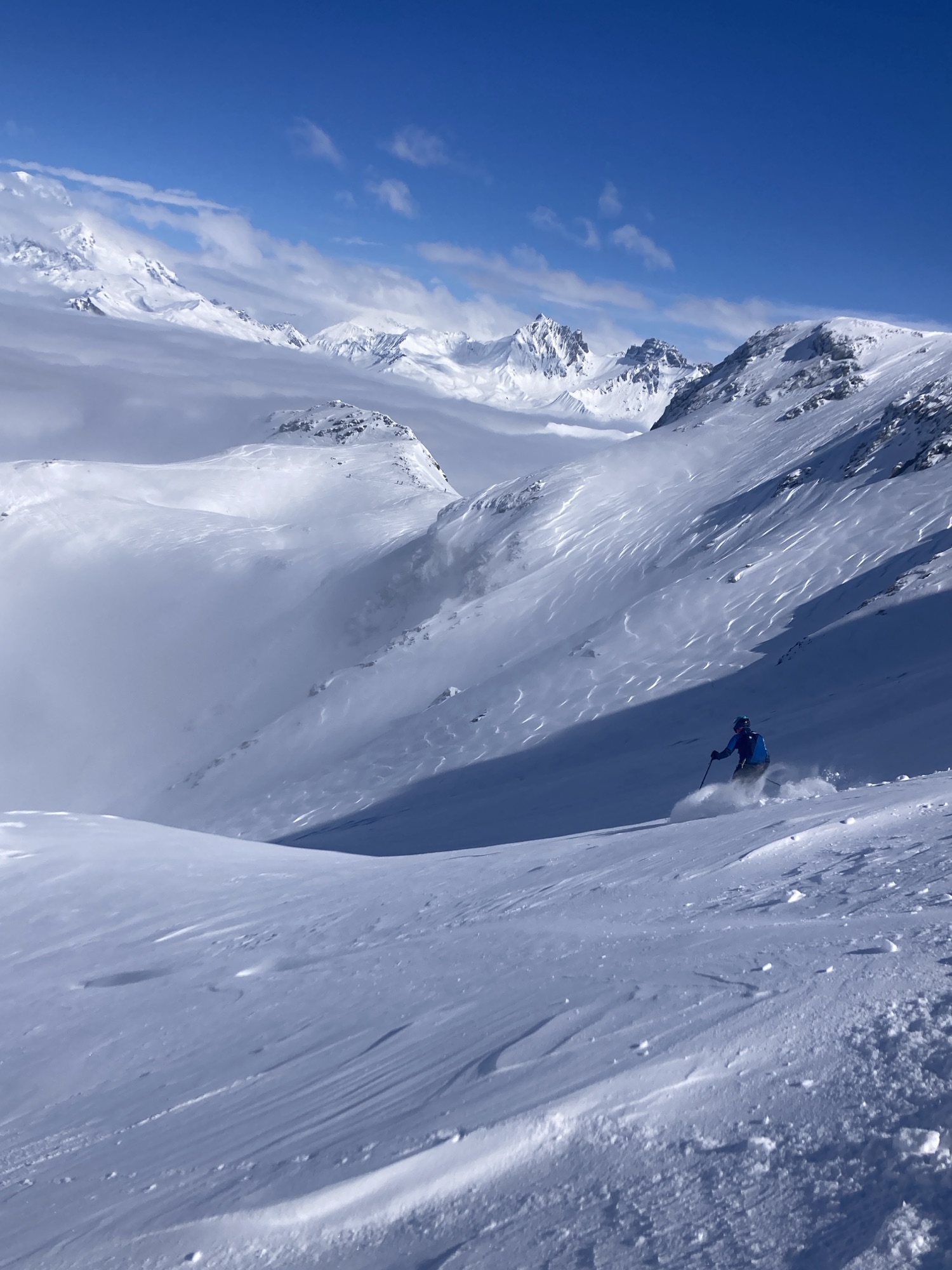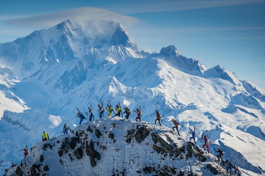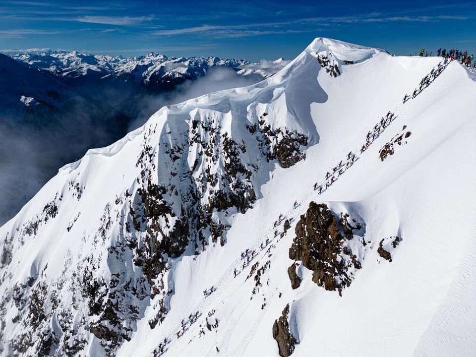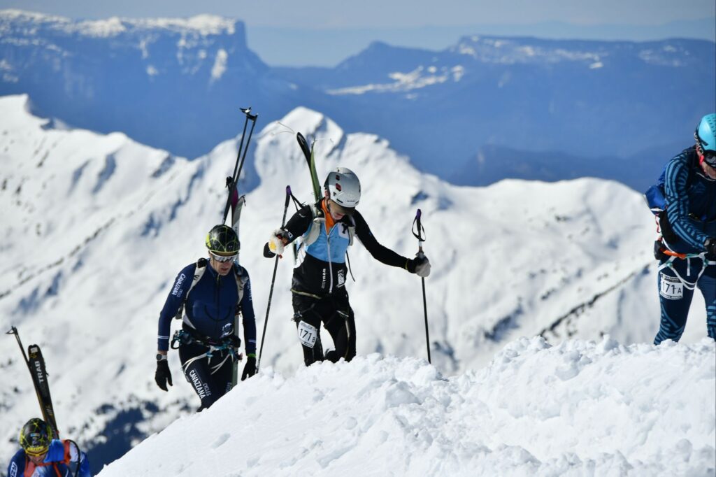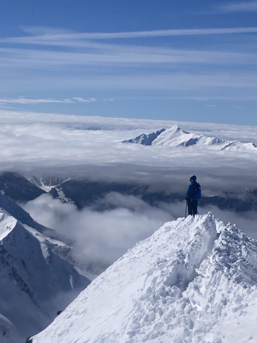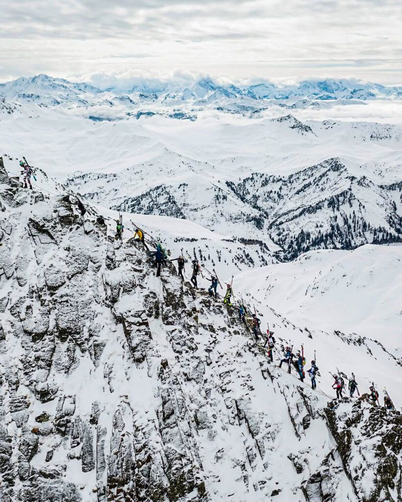 In my previous post I talked a bit about my little struggles with the first coupla stages of the Pierra Menta, which were frustrating if for no other reason than I typically have a great gut. I drink lots of untreated backcountry and developing country water, plenty of street food, etc. with very few problems (though those “few” have been memorable!). And I wasn’t alone: Colter needed some Immodium as well, and daughter Carson -who was competing in the 2 day junior event, had her own gut issues, and I know at least that Emilie Forsberg (Killian Jornet’s wife, who’s a pro enduro athlete as well) had to drop due to her partner getting sick. Before the race began we saw a few athletes carrying in big bottles of water and boxes of food; maybe they knew something we didn’t? In this case at least both times I seemed to recover from the GI issue pretty fast, if not my overall energy level, and Colter wasn’t too badly affected. And though I at least was a bit compromised, part of the warped incentive to carry on with the race was that the third stage was kind of the Queen Stage; in the middle of the stage we would top out on the Grand Mont, the biggest mountain in the area. Though it’s an easy skin from one side (that we did after the race, with a 2000’ lift bump!) we were to ascend the NE ridge, which is not only kinda knife-edged but also has plenty of rocks to scramble on, and it makes for some exciting “racing” in a really dramatic scene, and I realized that by making the time cut and carrying on that we could get that experience and more. So on to stage 3.