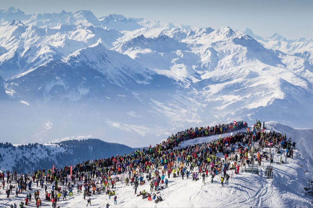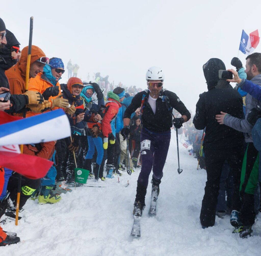 It was at this point that we faced the famous Pierra Menta bedlam. We’ve all watched the Tour De France on the big climbs where the riders are pounding along and the crowd is leaning in and barely parting for the riders to come through, and those crowds are shrieking in the ears of the riders. Well, Pierra Menta is the biggest race of its kind in the world and it is in France, so the skimo spectators want to react in kind! Despite the fact that the top of the Grand Mont was a 1500 foot skin up from the top of the nearest lift, there were hundreds of people there, and the screams, whistles, huge cowbells, and horns (almost) drowned out the couple of chainsaws that doods hauled up there to roar in our ears! It was nuts.