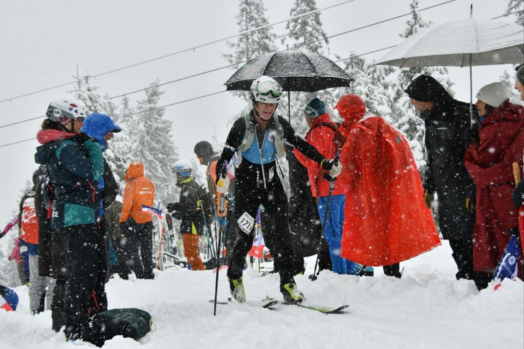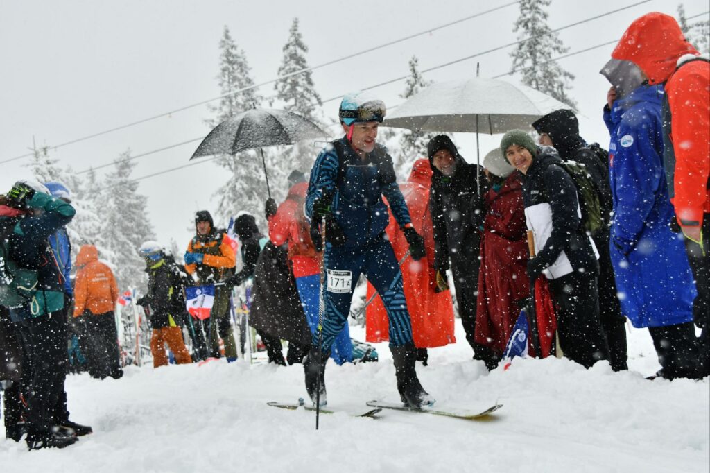 And while exciting, also a bit unnerving as we transitioned, which takes some concentration to do it fast, especially since we had cramps (kind of!) on and the skinned-up skis on our back. We finally pushed off and the bedlam faded…..and we charged down into yet another steep icy couloir that led onto a chundered up slope below and continued on for 2000 feet. Concentrate! Later I got to a spot that was easily accessible by chairlift and a popular place for spectactors, and again the crowd was deafening, of course Chainsaw Guy. Though we were on skins the track went downhill, and I yelled at the official-looking guy “skins or no skins?!” I couldn’t hear his answer (probably in French anyway) and I thought it was a transition, so I ripped my skins, then shoved off without my toe in the binding and instantly faceplanted, and then through the screaming crowd I realized that it wasn’t a transition after all! Shitshow…..